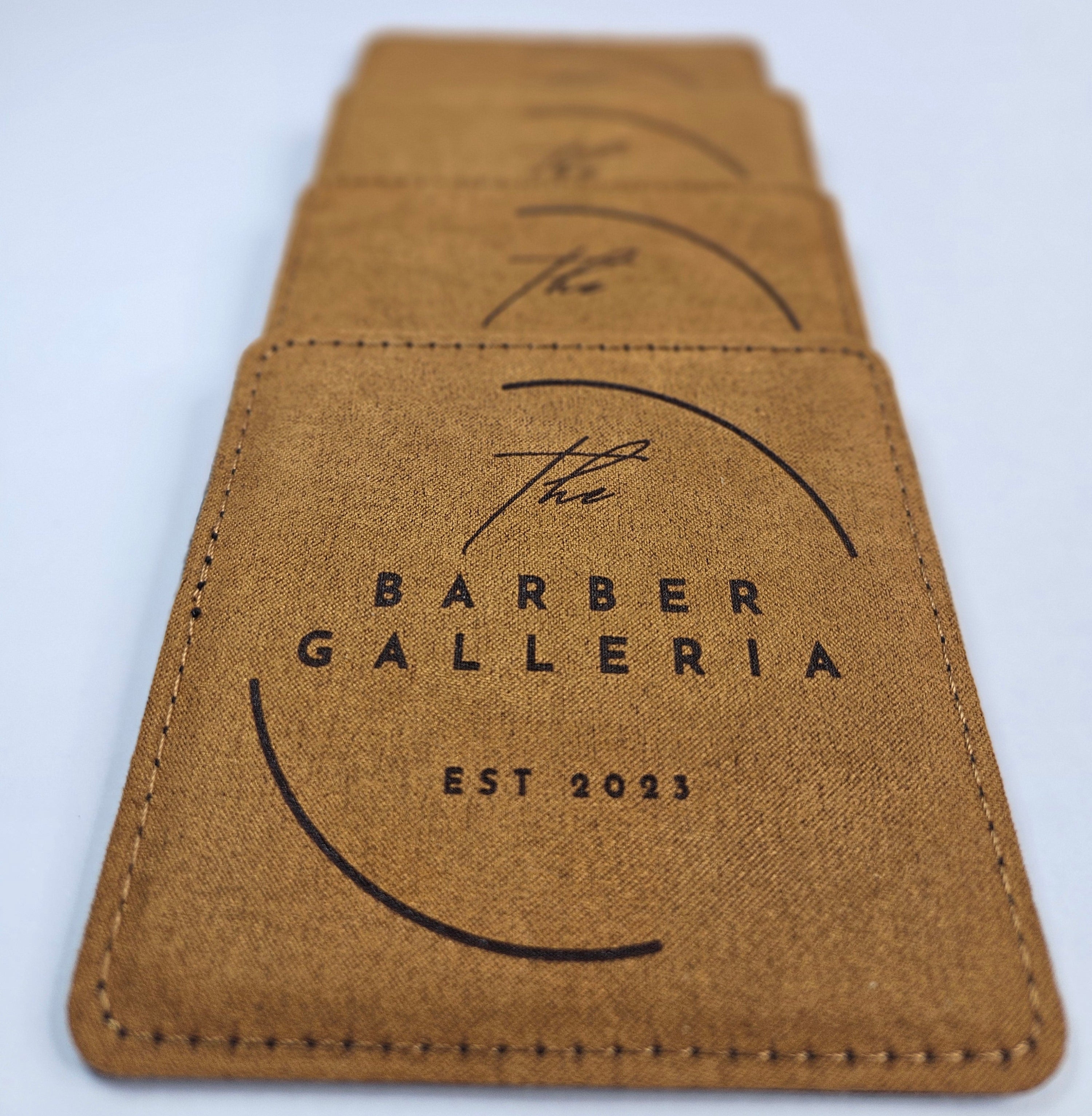 Custom laser-engraved leather coasters produced for The Barber Galleria, a high-end gentlemen’s barbershop in Fort Walton Beach, FL. Designed for upscale retail and in-shop use.