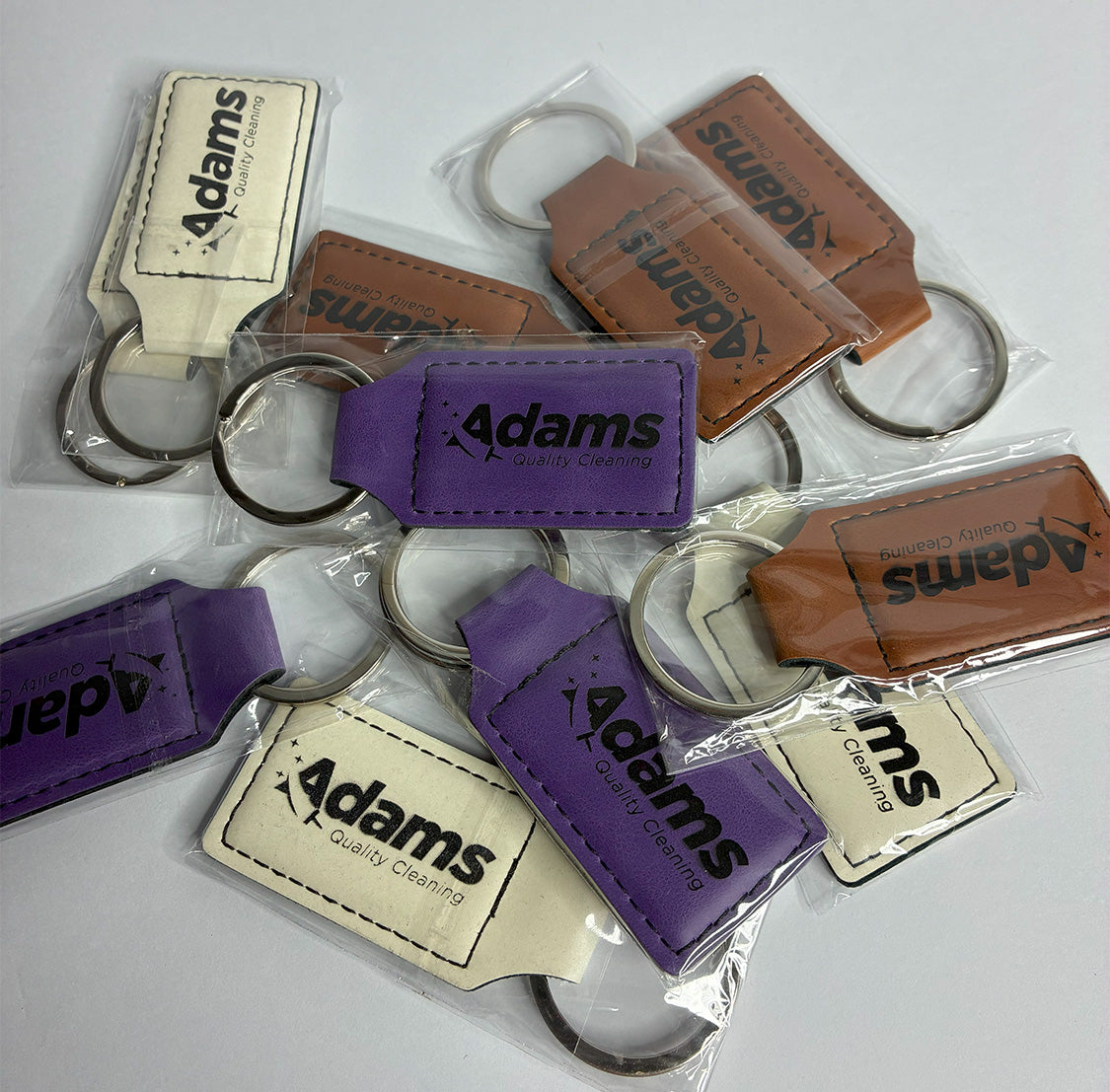 Custom QR-code keyrings produced for Adams Quality Cleaning, used across commercial buildings for property identification and access. Durable, glow-in-the-dark options help improve visibility and reduce lost keys.